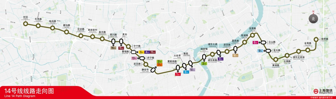 14号线工程西起嘉定封浜东至浦东金桥,贯穿上海城区市中心,途经嘉定区、普陀区、静安区、黄浦区和浦东新区,正线全长38.514公里,共设地下车站31座,其中6站6区间与东西通道工程合体共建。14号线为八节编组大客运量全自动驾驶线路,可与轨道交通网络中其他13条轨道交通线路换乘。