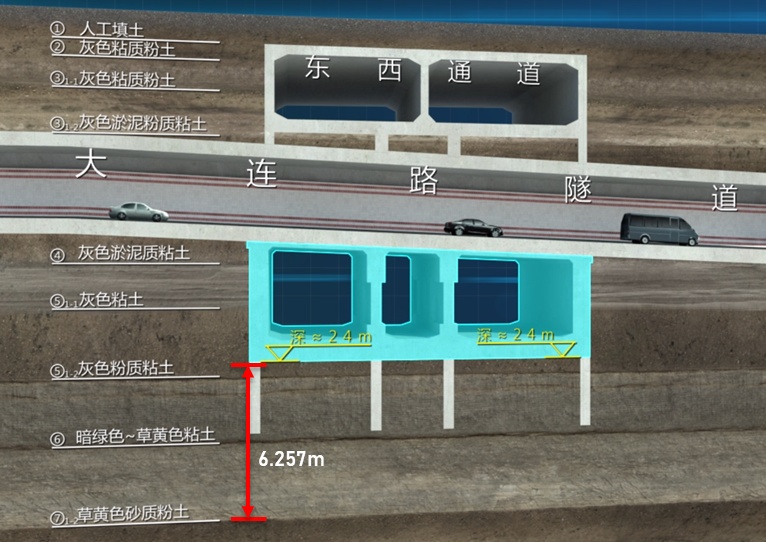 浦东大道站中间标准段正好与已建大连路隧道斜交,下穿大连路隧道,采用了大体积冻结暗挖施工工艺,冻结暗挖体量约6000方,相当于40个旁通道开挖量。