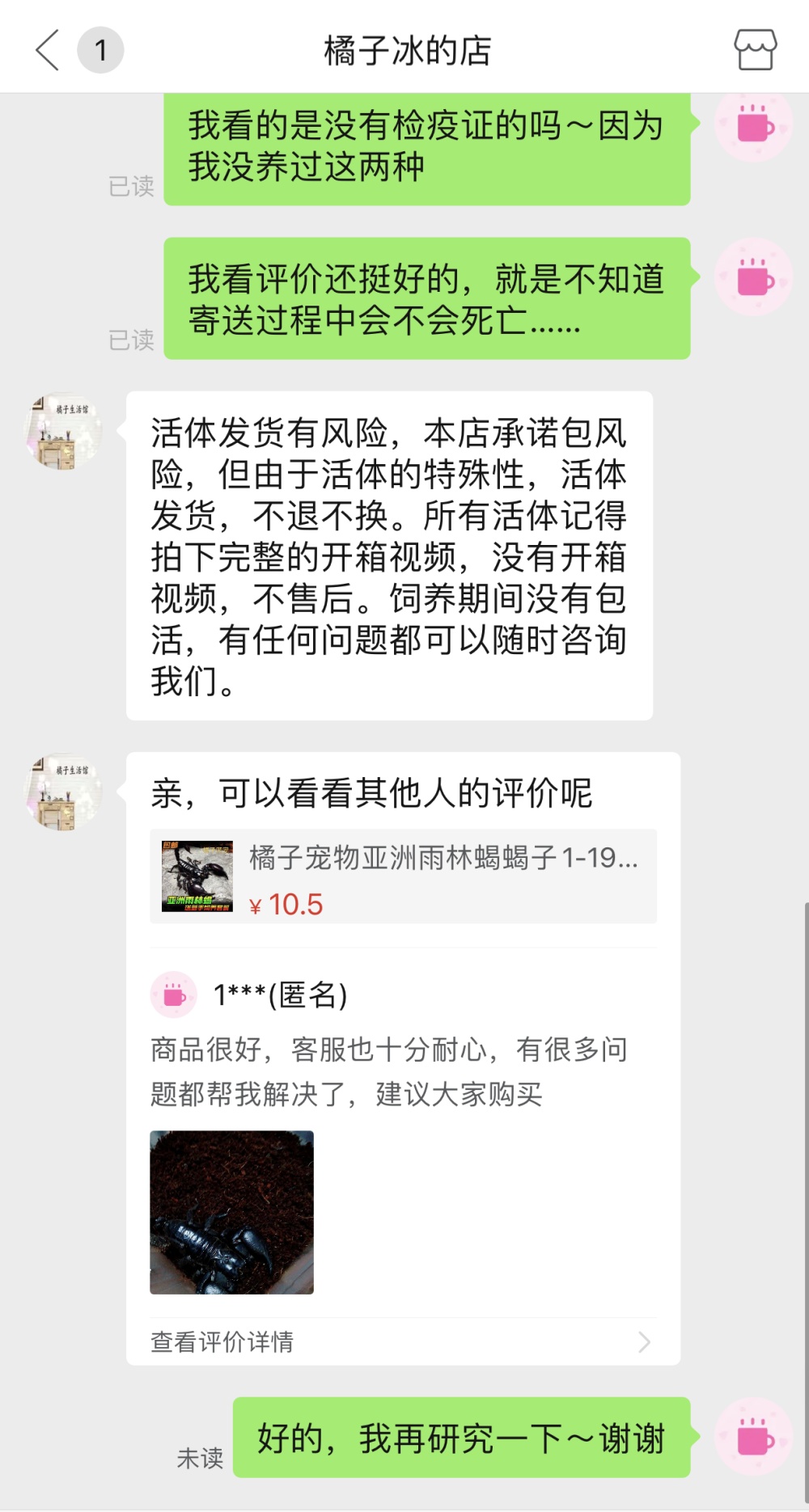 在一家名为“橘子冰的店”中,记者化身消费者,向店主要亚洲雨林蝎、蓝薄荷角蛙的检疫合格证,店主表示“没有这样的”,并且说“由于活体的特殊性,活体发货,不退不换”“饲养期间也没有包活”。