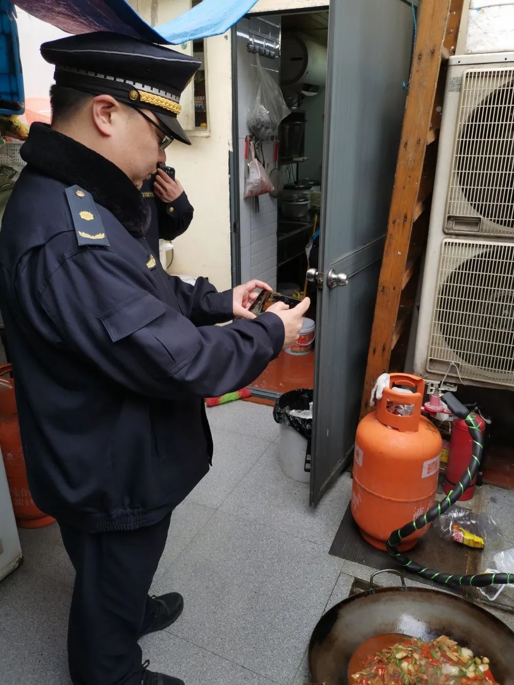 主要对辖区各商场、餐饮企业的燃气报警装置是否年检、燃气报警装置是否正常使用,“紧急遮断阀操作盘”是否经过保养维护进行检查。检查中发现有餐饮商户安装使用的燃气报警装置涉嫌未定期检测,且商户当场无法出示检测报告,执法队员立即拍照取证,并现场开具责令改正通知书以及谈话通知书。