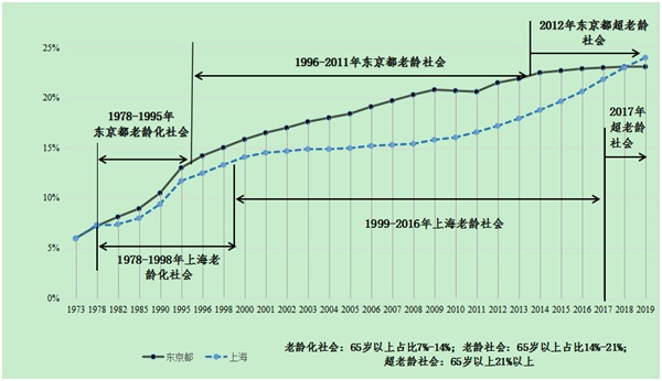 图1:上海与东京都老龄化现状及趋势图