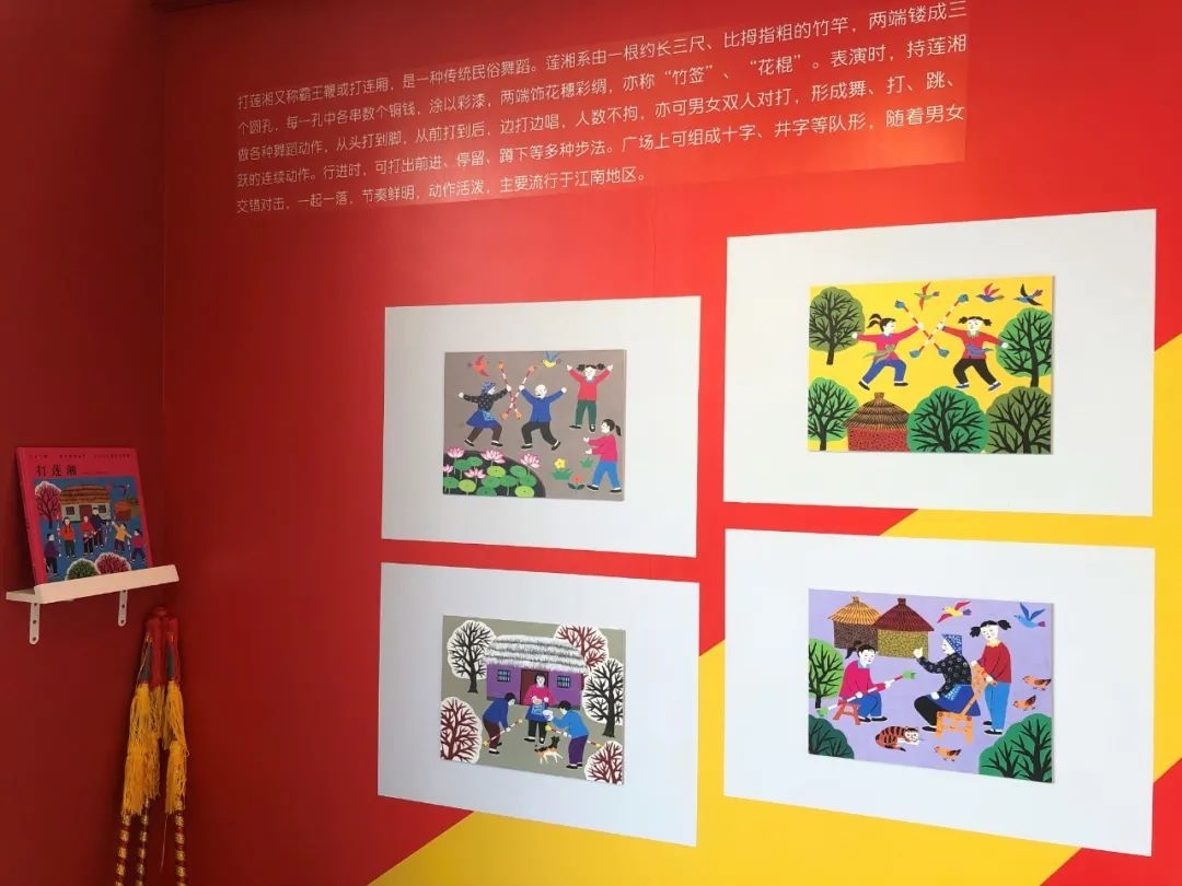 来自廊下的农民画画家严军杰,把廊下镇的传统民俗——打莲湘,作为创作的主题。“让更多的人通过绘本,更直观地了解打莲湘是什么,以及这项传统民间舞蹈的发展起源等等。”