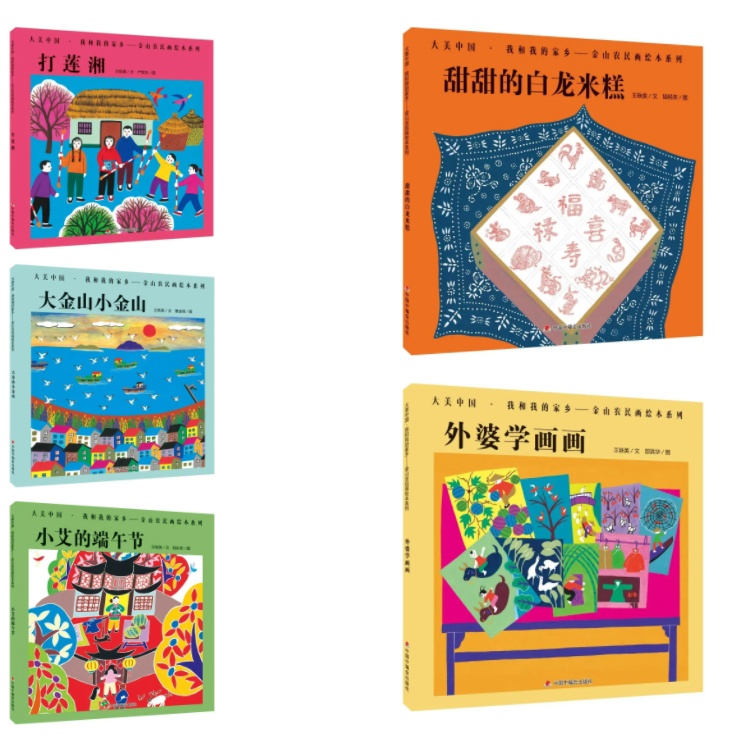 由中国中福会出版社与金山农民画院共同策划出版的《大美中国·我和我的家乡——金山农民画绘本》系列首次与读者见面。该系列包含《大金山小金山》、《小艾的端午节》、《打莲湘》、《外婆学画画》和《甜甜的白龙米糕》,绘本的文字作者是金山走出来的儿童文学作家王轶美,图画则由曹金根、陆永忠、严军杰、邵其华、陆经农等五位金山农民画画家集体创作。
