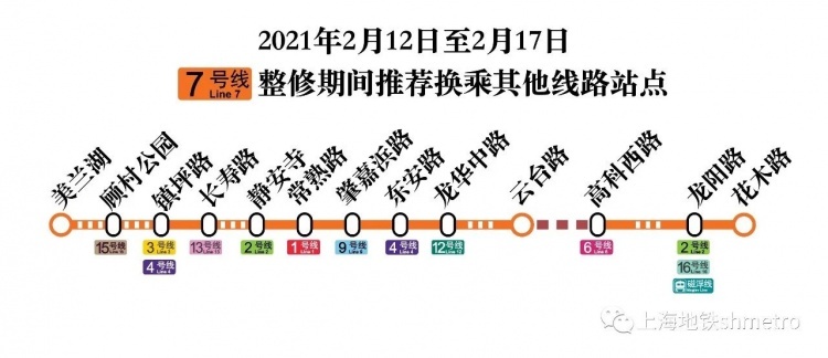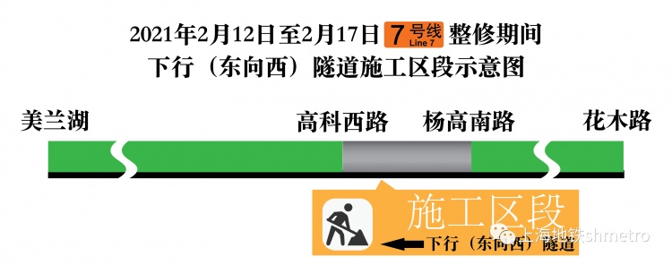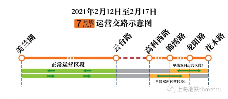 申通地铁集团说,为保障隧道结构安全,2021年2月12日至2月17日(年初一至初六,共6天),轨交7号线杨高南路至高科西路下行(东向西)单向隧道临时停运整修施工。其间,7号线实施分段运营,美兰湖站至云台路站开行小交路,云台路站至高科西路站区间临时停运,高科西路站至龙阳路站(上行)、花木路站至锦绣路站(下行)采用列车单线双向方式运营。