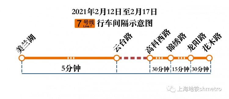 届时,7号线北段美兰湖站至云台路站区段行车间隔维持5分钟;南段高科西路站至锦绣路站、龙阳路站至花木路站区段列车班次间隔延长,行车间隔调整为约30分钟;锦绣路站至龙阳路站区段行车间隔调整为平均15分钟(详见下图)。提请受影响的乘客预留充分出行时间。