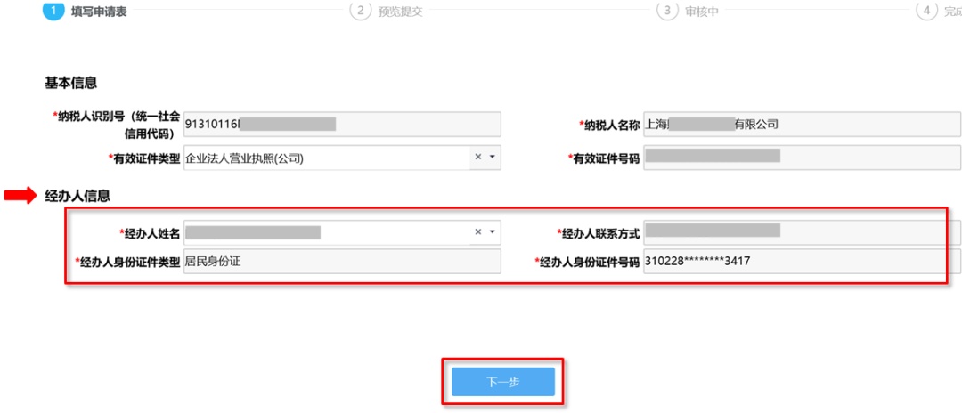 填写申请表:页面自动会带出纳税人基本信息,选择办税员,完成后点击[下一步]