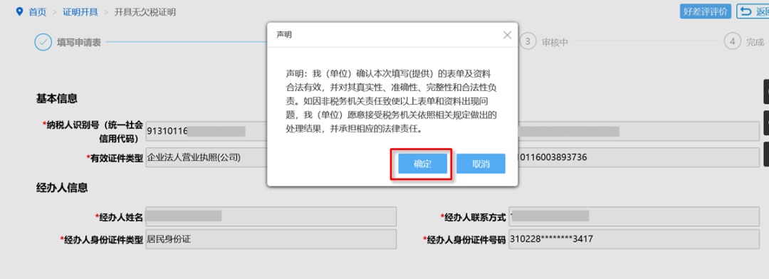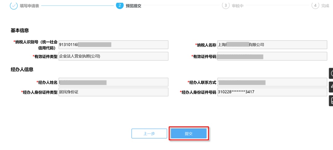 ①核对基本信息和办税人信息无误后,则可点击[提交](若有问题则可点击[上一步]返回修改)