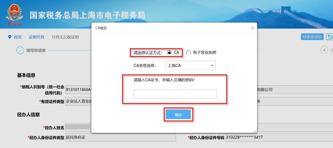③认证方式选择CA,在空格处输入CA密码,点击确定