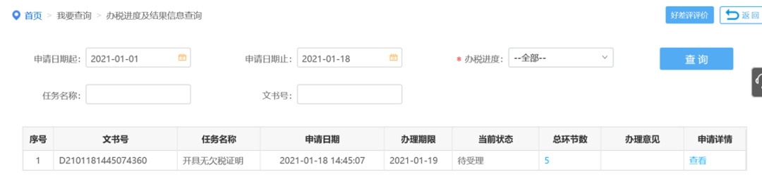 提交成功的事项可以在“我要查询”---“办税进度及结果信息查询”中进行查询受理状态