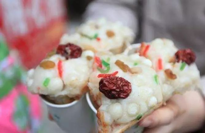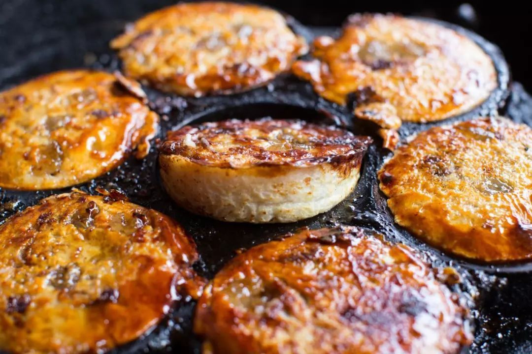 海棠糕,制作工艺和梅花糕差不多。注入面浆后,放入豆沙、枣泥等;接着,搅拌面浆将其盖上;随后,撒上红枣、瓜子仁、红绿丝等。稍有点不同的是,制作海棠糕要另熬一锅焦糖,趁砂糖还未完全融化时,迅速将一边的海棠糕翻过来放在上面。在细火下,砂糖渐渐被面团吸收,成了褐色般的焦糖底。底脆馅儿甜,一口下去唇齿留香。