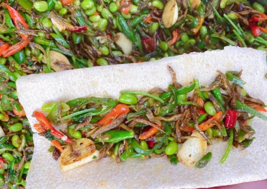 连云港人款待客人时,总离不开小鱼煎饼。这是一道富有地方特色和浓郁民间风味的点心。一张张用干面做成的煎饼有荷叶那么大, 散发着诱人的香味, 既薄且微脆,却又富有韧性。煎饼中间卷入青椒小鱼,咬上一口,满口清香,五味俱全。