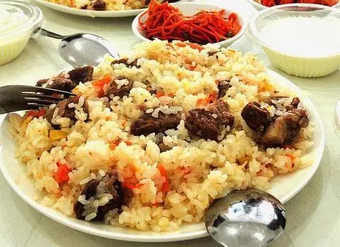 新疆维吾尔族人的春节第一餐吃以大米、羊肉、葡萄干做成香喷喷的普罗,还吃用面粉、羊肉等做成的包子和用带骨羊肉做成的手抓羊肉。