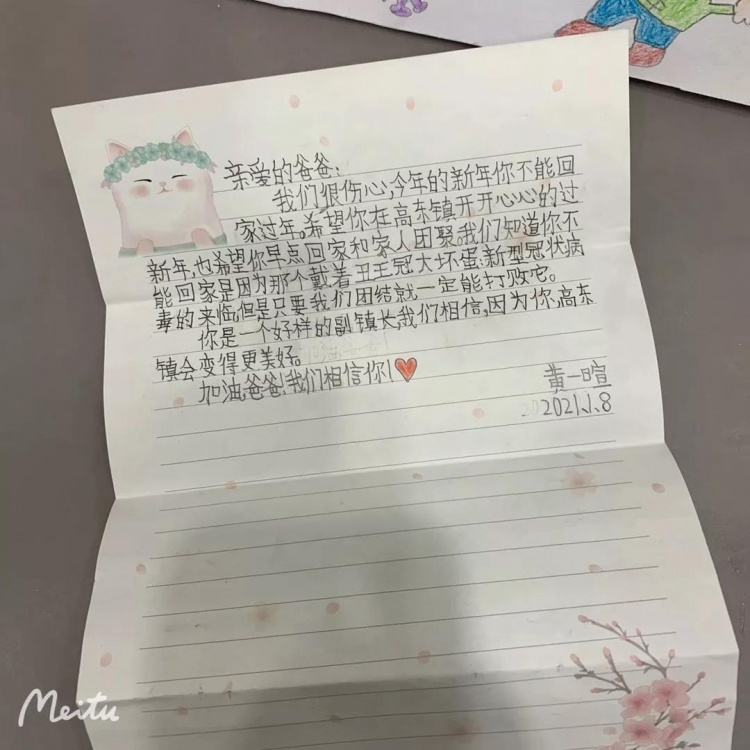 “最美家书”:“亲爱的爸爸:我们很伤心,今年的新年你不能回家过年。希望你在高东镇开开心心过新年,也希望你早点回家和家人团聚……加油,爸爸!我们相信你!❤”