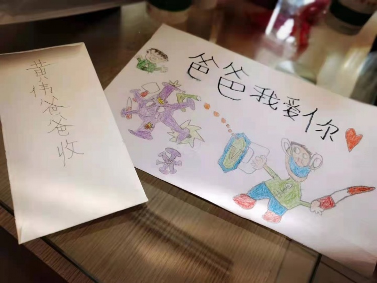 “收到家里两个宝贝的礼物,有点小感动。”黄伟感慨万千,“过去孩子有在小纸片上给我写过一两句话,这是我第一次收到这么正式的来信。”