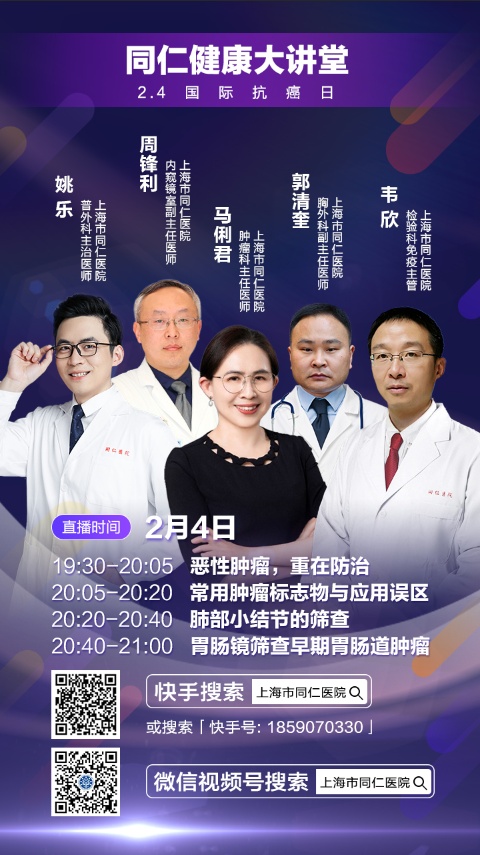 讲师:肿瘤科主任医师—马俐君 检验科免疫主管—韦欣 胸外科副主任医师—郭清奎 内窥镜室副主任医师—周锋利 课题:国际抗癌日直播活动 |