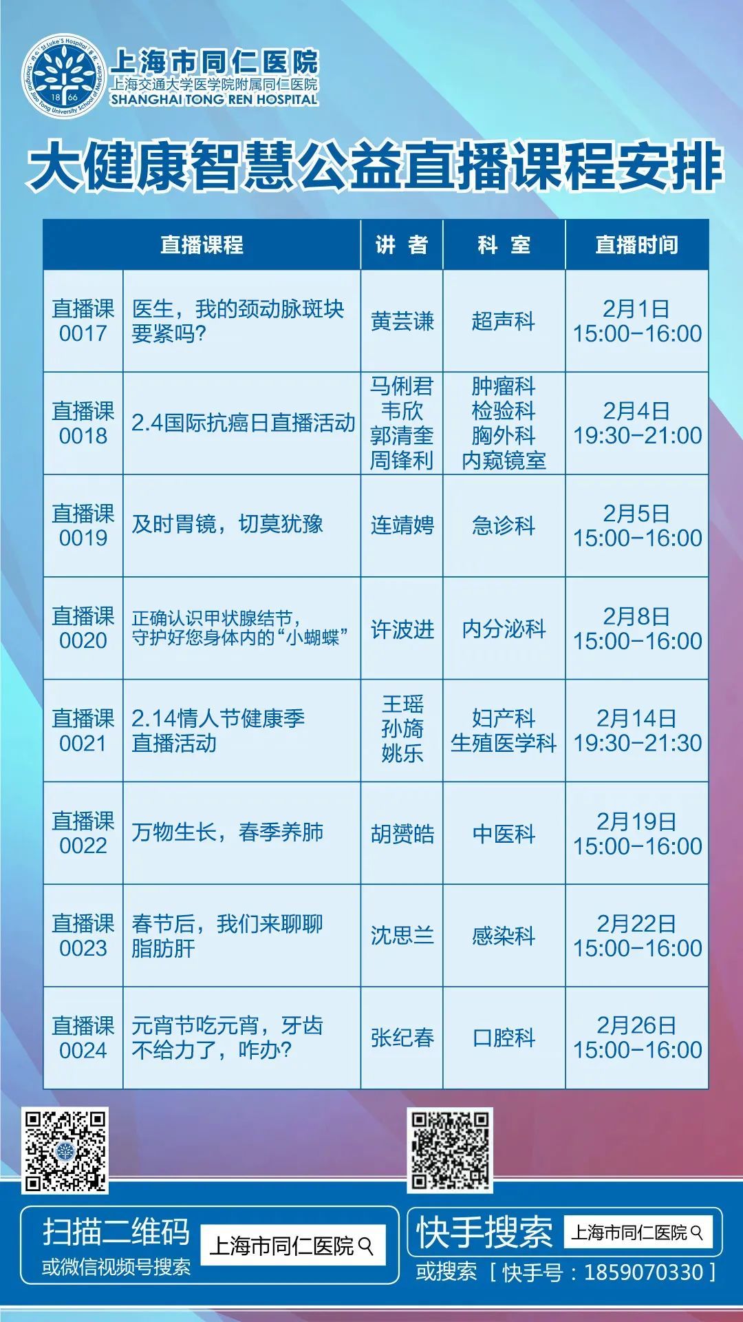同仁大健康智慧公益直播2月课程,特邀几大科室主任坐讲,直播内容精彩纷呈,期待您如期赴约哦!