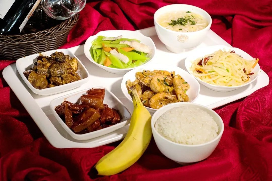 黄油焗大虾 香菇蒸滑鸡 江南红烧肉 莴笋炒肉片 酸辣土豆丝 香菜豆腐羹 米饭 香蕉一根