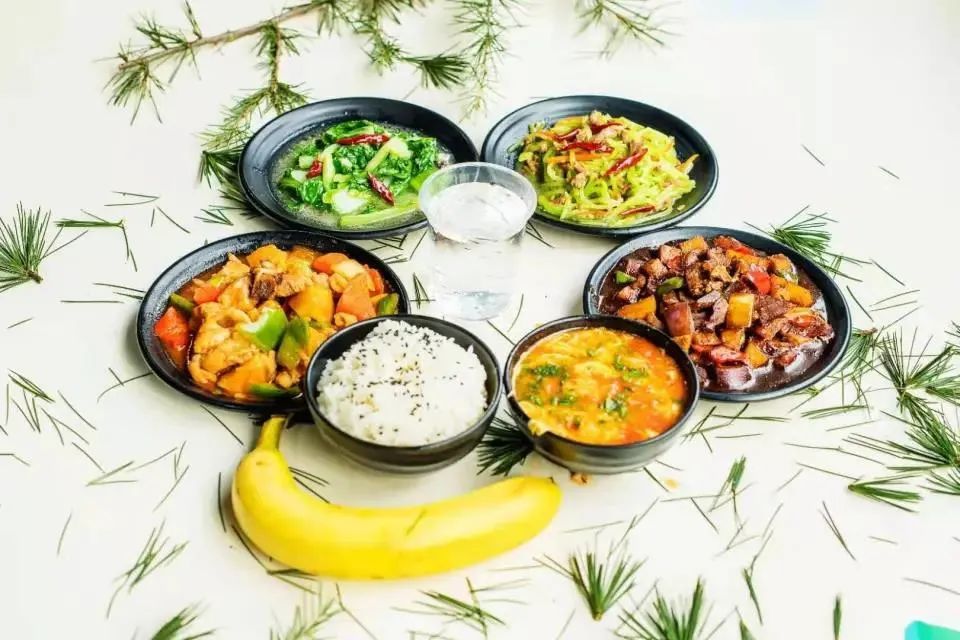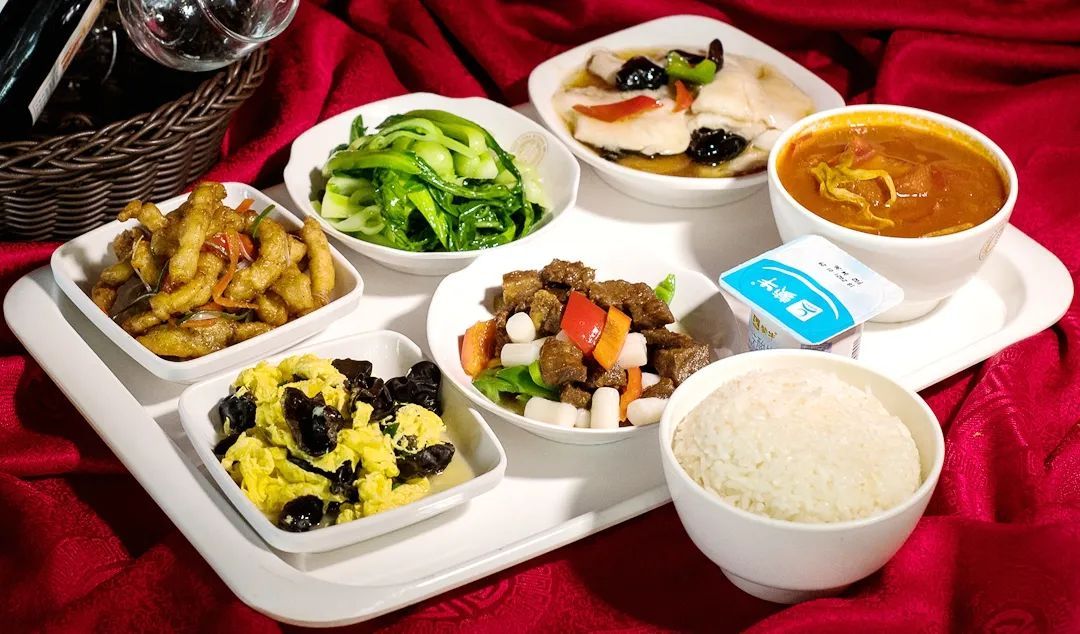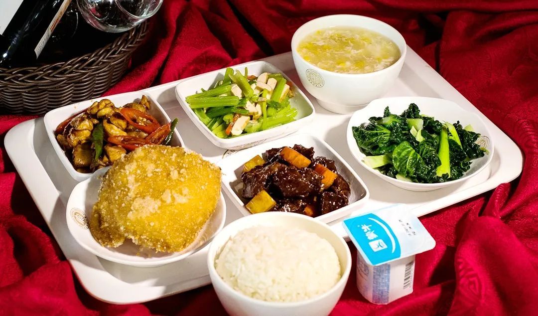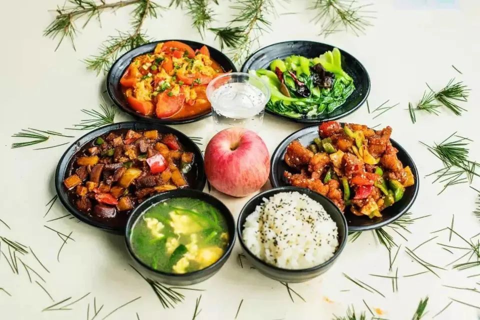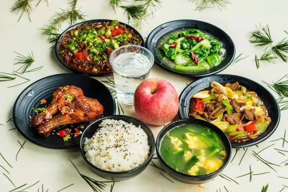 红烧牛肉 飘香辣子鸡 番茄炒鸡蛋 素炒小青菜 菠菜鸡蛋汤 米饭 水果一个 饮料一瓶