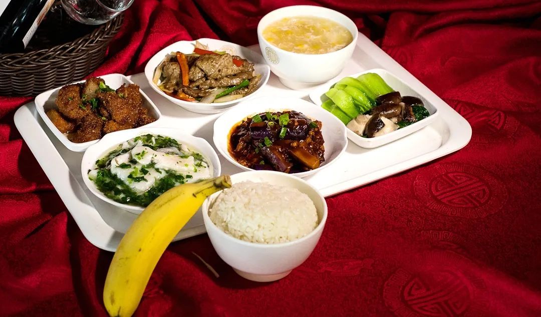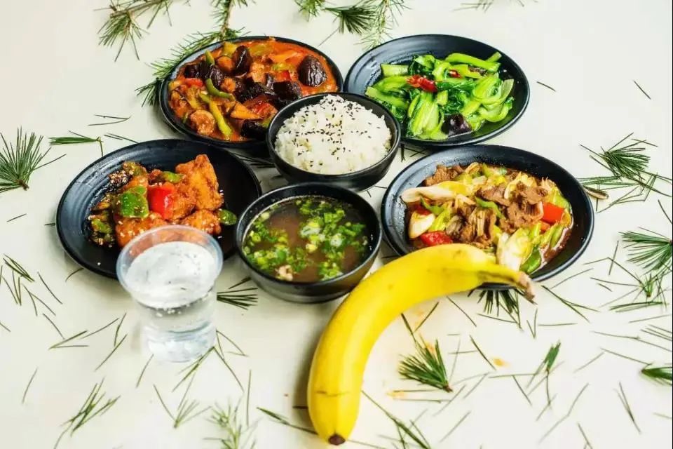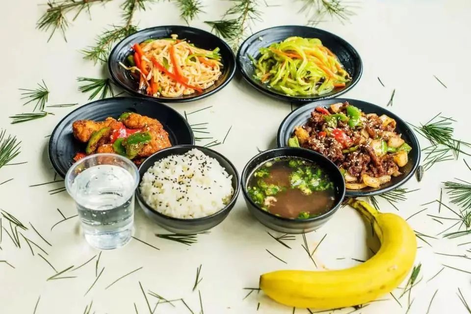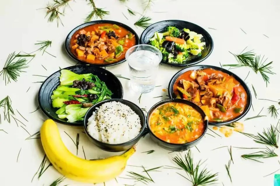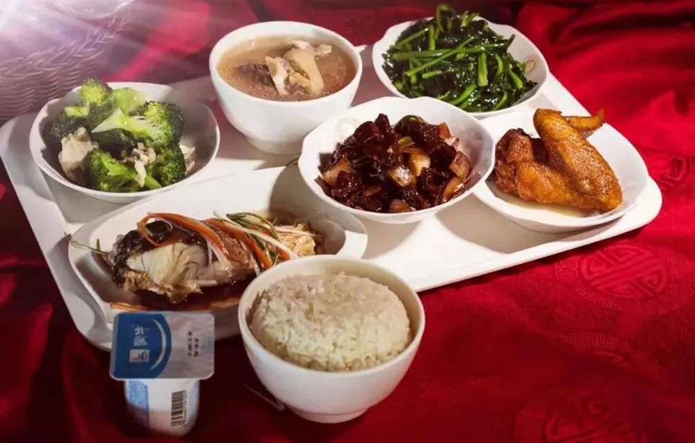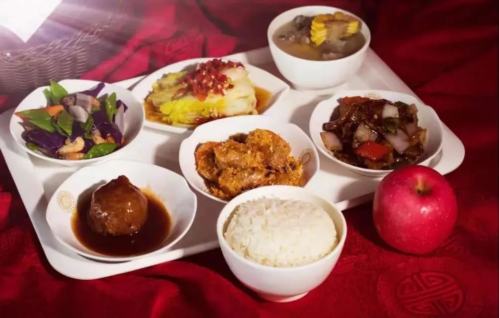 红烧牛肉 飘香辣子鸡 番茄炒鸡蛋 素炒小青菜 菠菜鸡蛋汤 米饭 水果一个 饮料一瓶