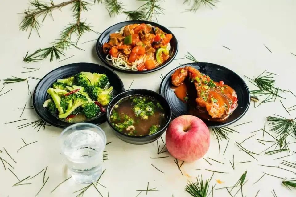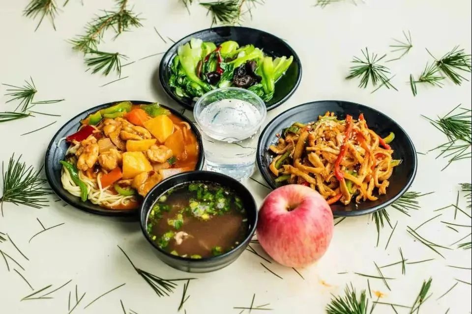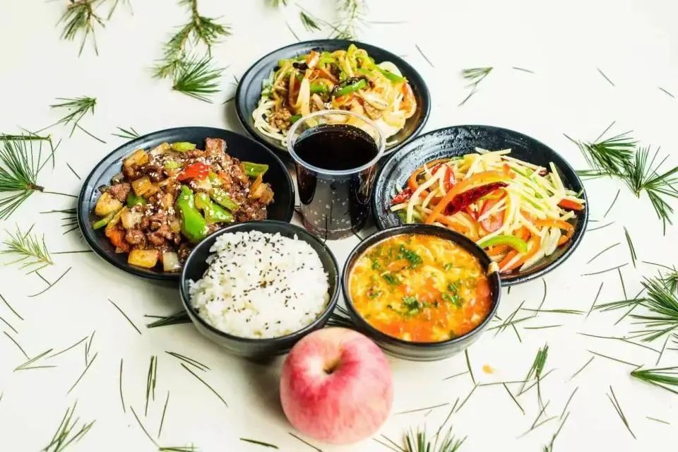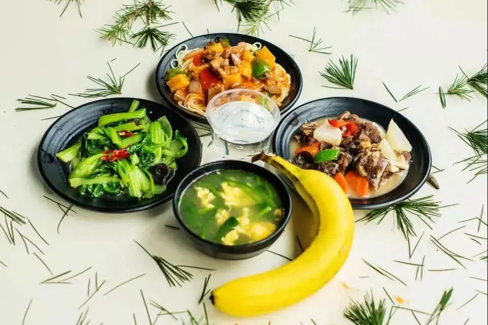 萝卜炖羊肉 木耳炒油麦菜 土豆牛肉拌面 菠菜鸡蛋汤 水果一个 饮料一瓶