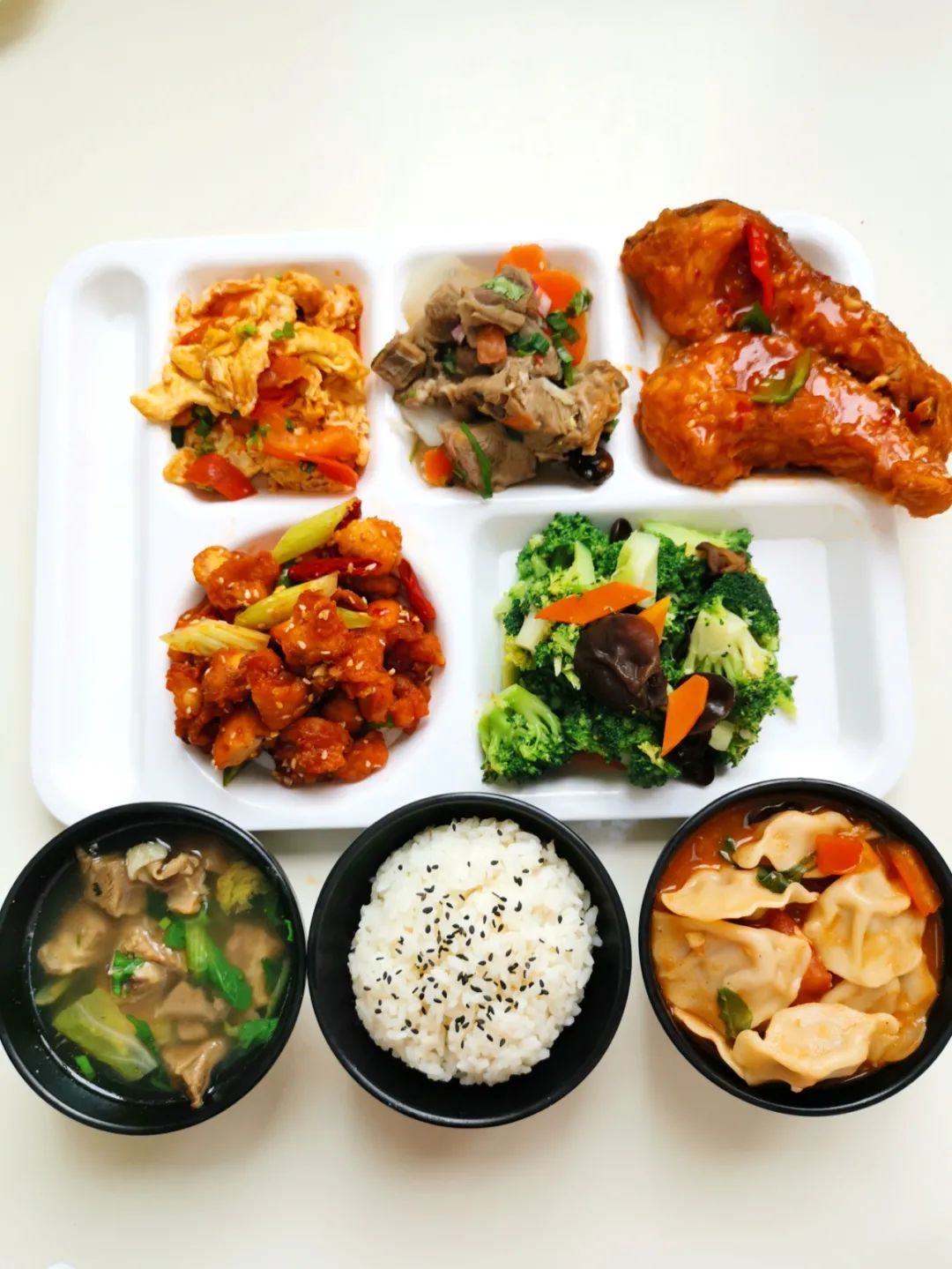 大盘羊肉 土豆烧牛肉 西兰花炒肉片 木耳炒青菜 番茄鸡蛋汤 米饭 水果一个 饮料一瓶