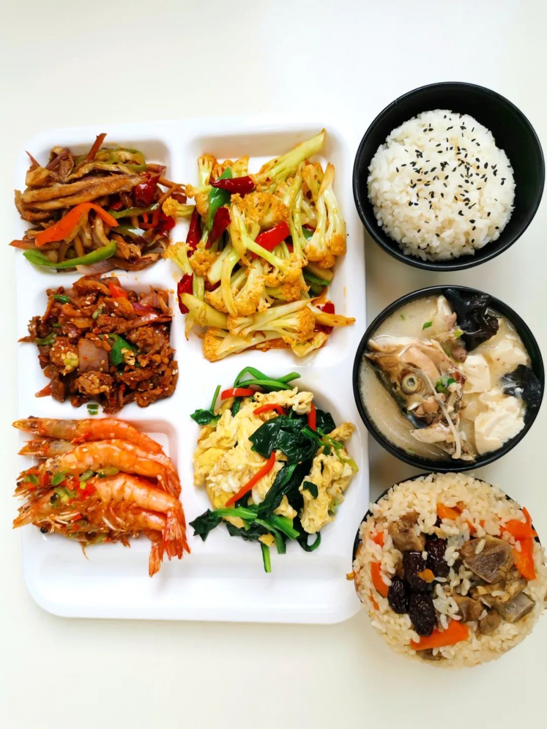糟溜青鱼片 年糕牛肉粒 椒盐焗排条 木耳炒鸡蛋 菜油炒青菜 鲜滑罗宋汤 米饭 酸奶一杯