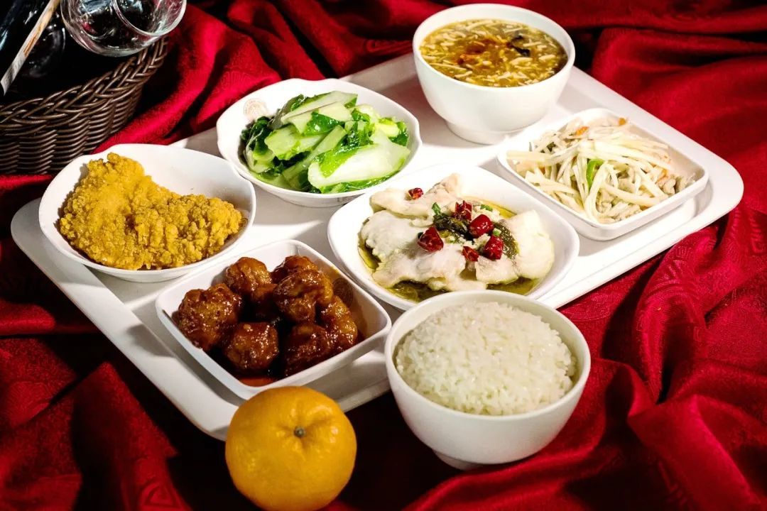 家乡酸菜鱼 菠萝咕咾肉 香酥炸鸡排 茭白炒肉丝 蒜泥杭白菜 川味酸辣汤 米饭 芦柑一只