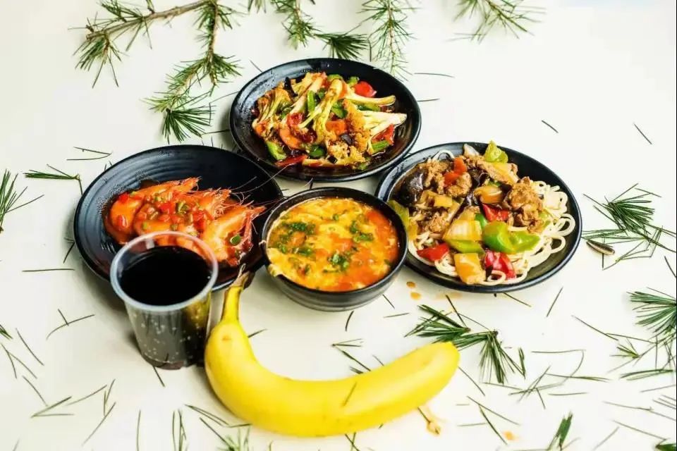 西域香辣虾 干锅花菜 新疆拌面 番茄鸡蛋汤 水果一个 饮料一瓶