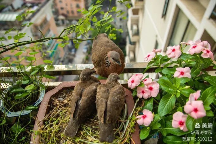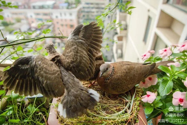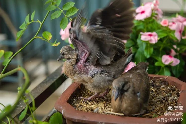 中午,两个大斑鸠齐上阵,轮番督阵、极尽诱惑。小斑鸠们也好像有了勇气,伸爪、展翅,慢慢挪到了花架边缘。小翅膀微微抬了抬,然后掉头回窝了。