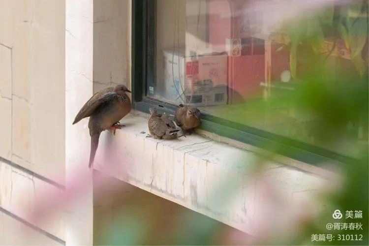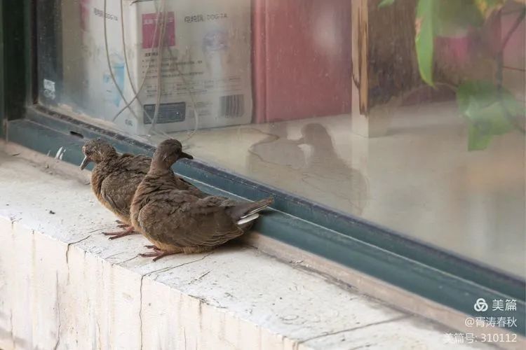 早晨,远望邻家窗台,却只看到了污迹斑斑,不见小家伙们。再低头一看——呀,两只小家伙回来了。
