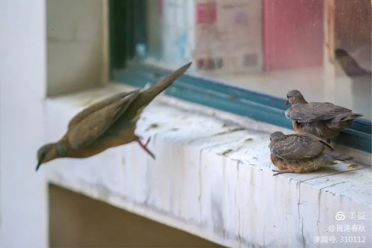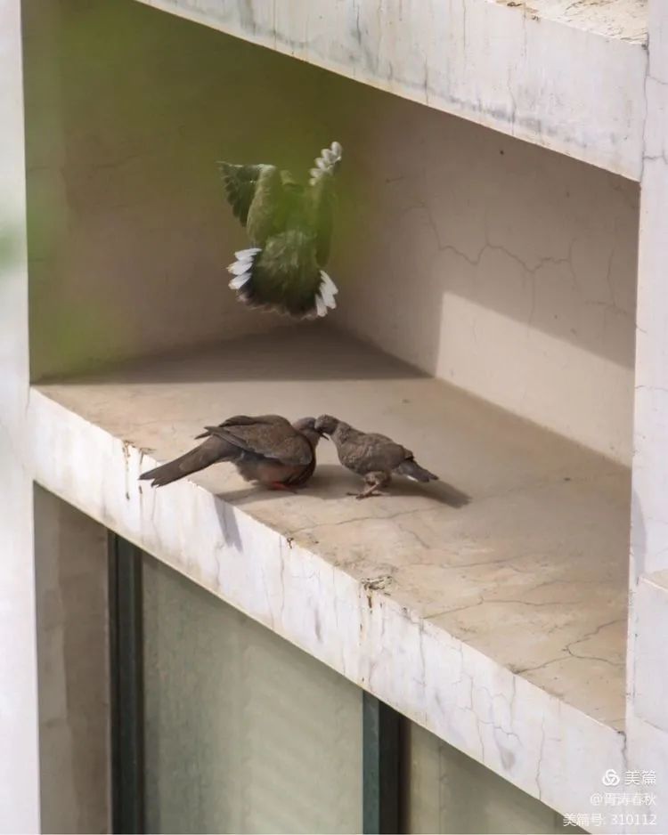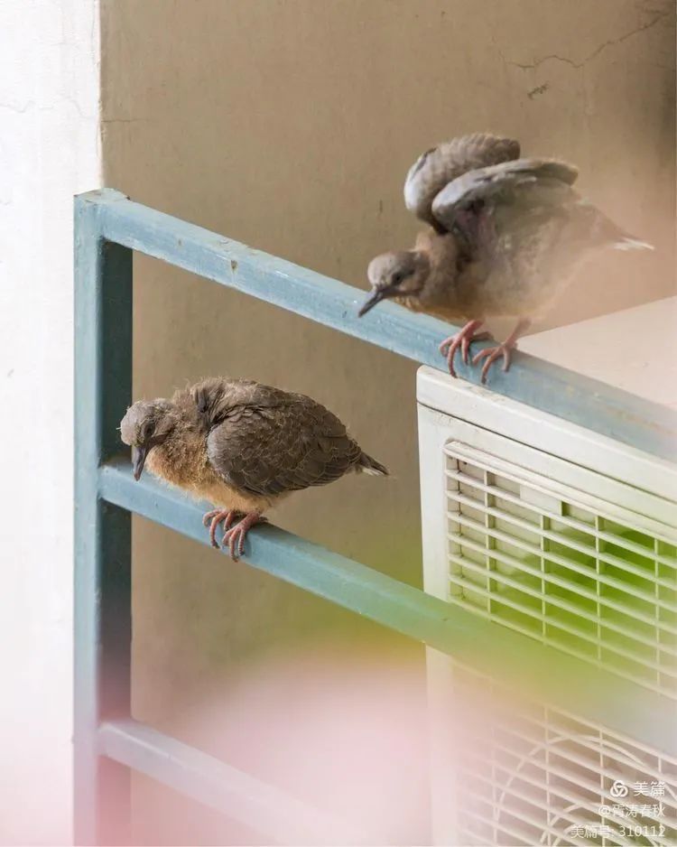 但令人惊心的是大斑鸠还在不断地引导小斑鸠继续飞跃。两只小家伙先后从飞到了隔壁家窗台的边缘上。此处仅10公分左右一条窄边,小斑鸠体长超过10公分,似乎转个身都有可能跌下去。