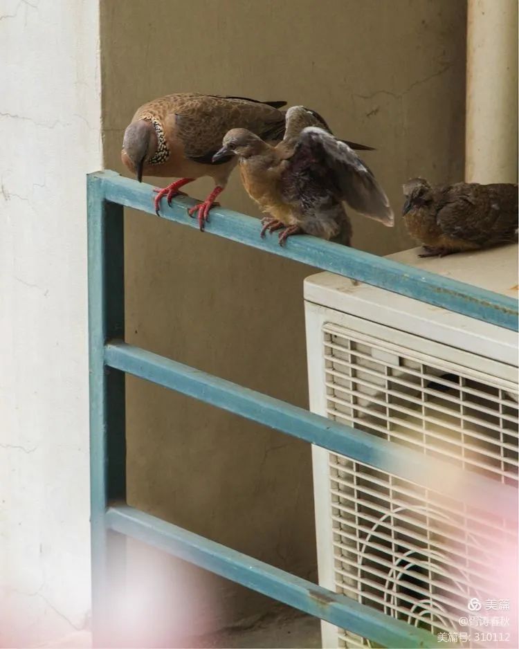 大斑鸠开始了反复的引导示范——从花架上又飞到隔壁邻居飘窗凹陷处示范。小斑鸠仿佛兴奋起来,移到花架边,突然展翅一跃,飞到了对面的空调架上。紧接着另一只小斑鸠也纵身飞跃过去。