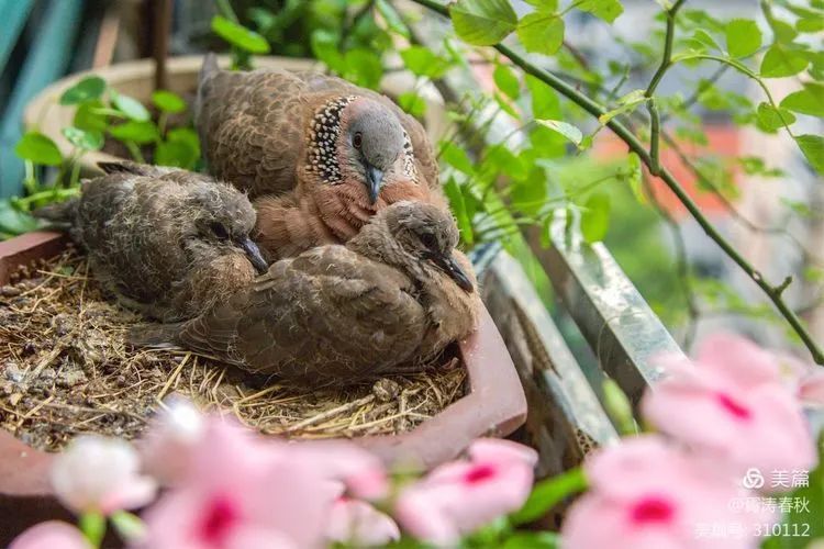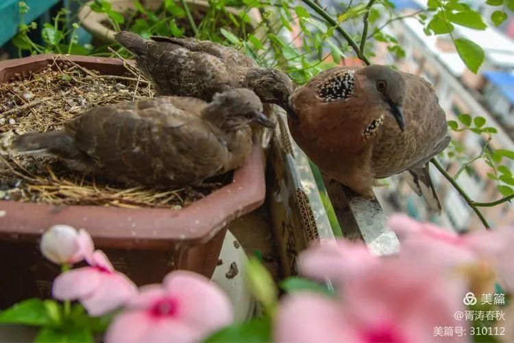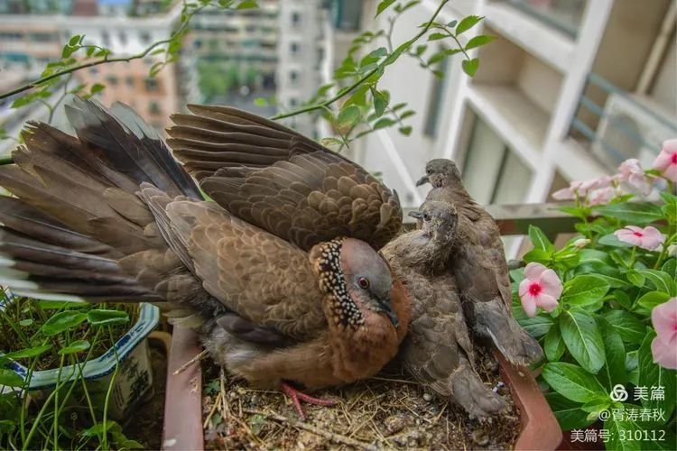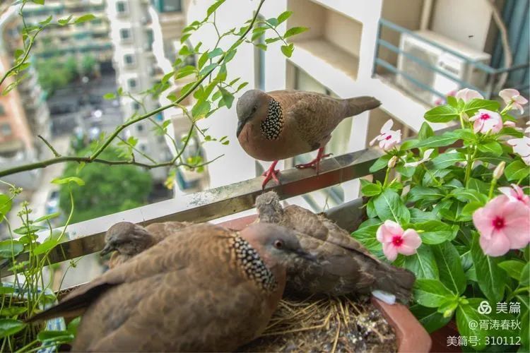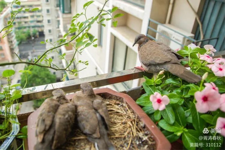这天还来了三个成年斑鸠,像是"莅临指导"。而这晚,大斑鸠开始让小斑鸠们自个过夜了。