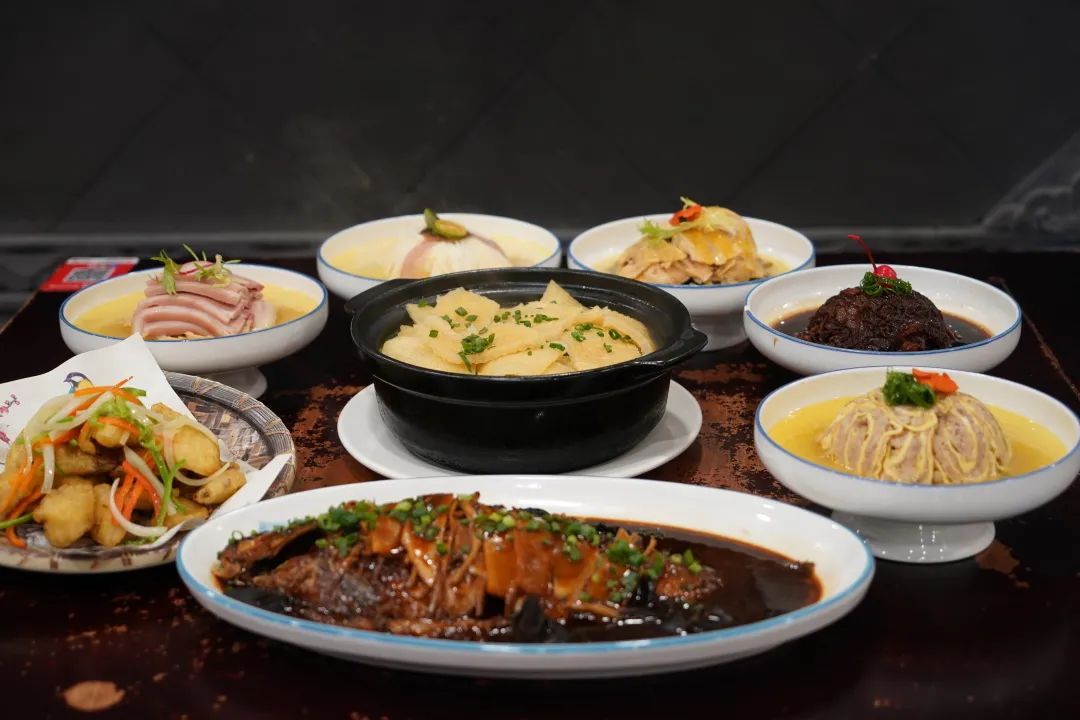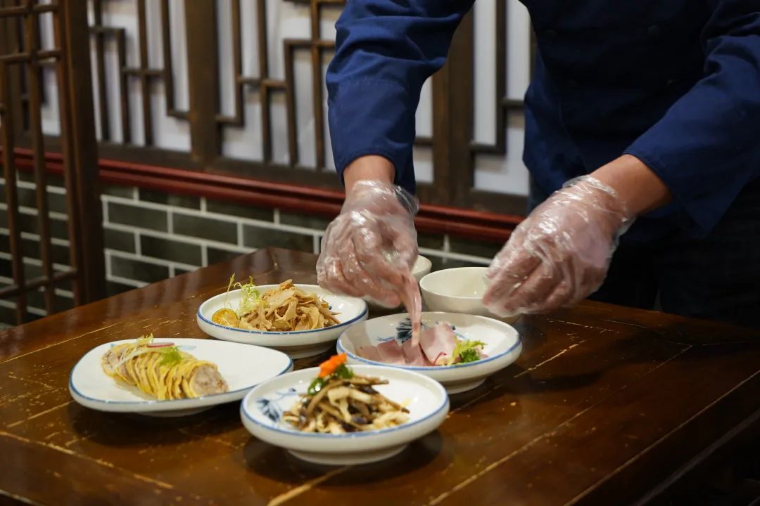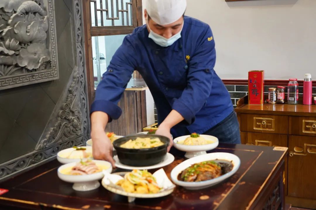 “把肉撕成一条条,是我们召稼楼当地特色,延续这一传统,一定意义上就是延续了我们的美食记忆。” 瞿育锋表示,而这八道菜多采用“扣”的方式装盘,或是摆盘成圆形,也象征着团团圆圆的意味,他安排后厨将整套老八样制作完毕后端上了八仙桌,吸引了一旁的食客赵师傅前来打卡拍照。