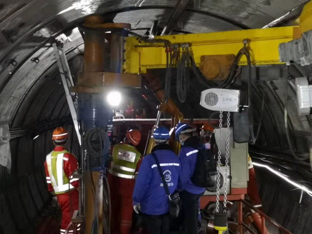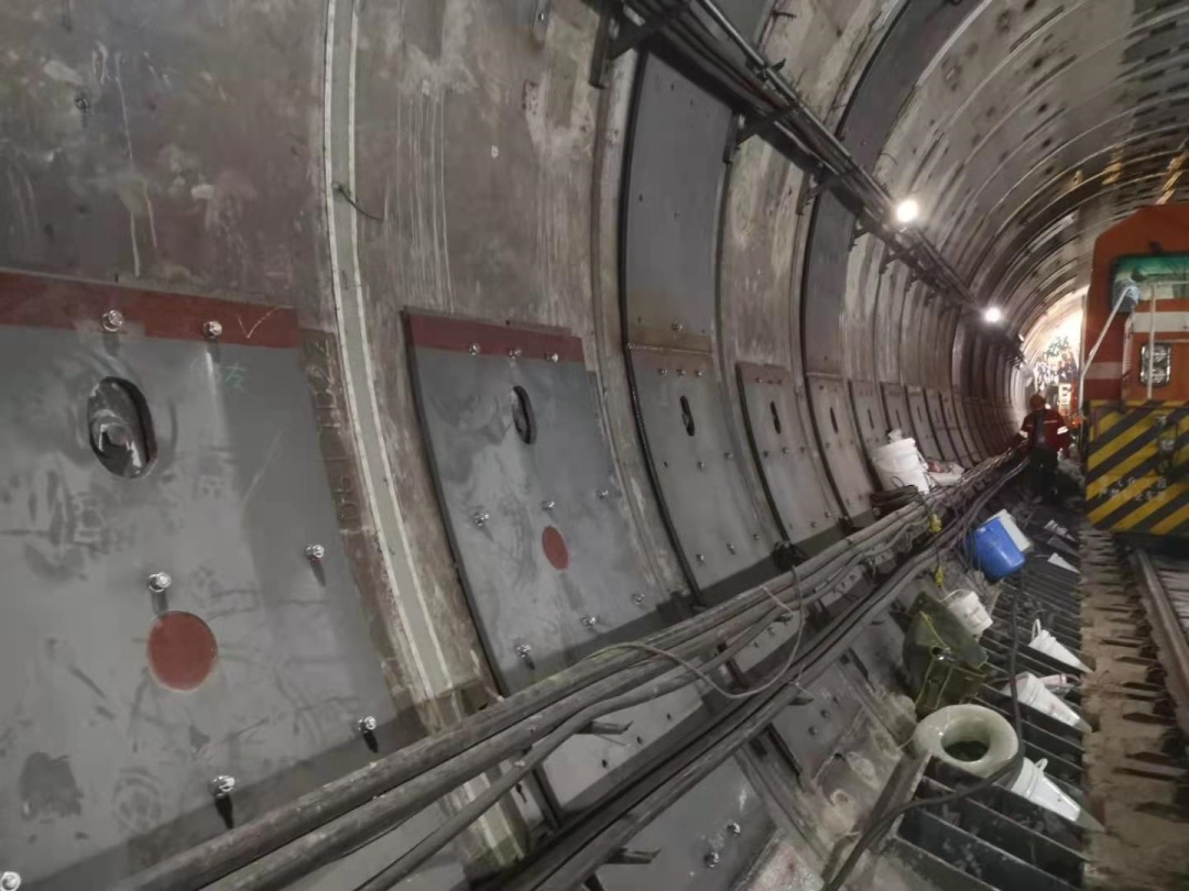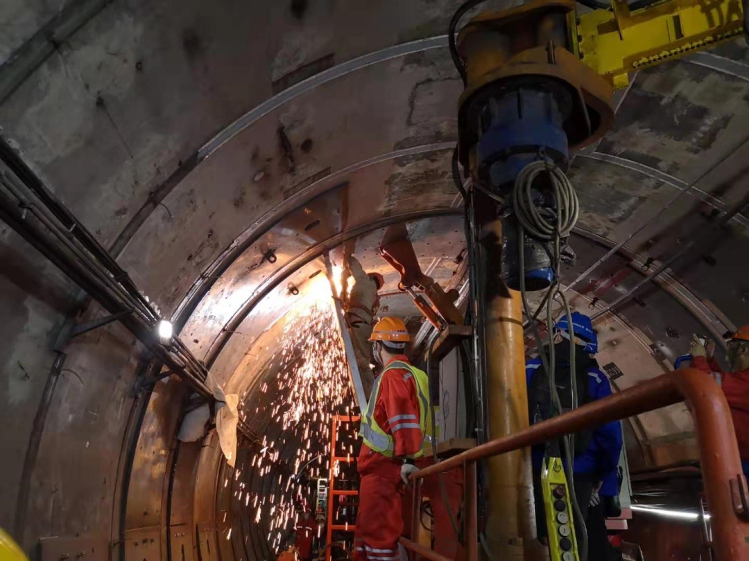 隧道内,由内燃机车牵引的专用机械手平板车上,摆放着各种施工设备,多位施工人员相互协作,将一块2厘米厚的钢板固定在弧形的隧道管片上。施工过程中,不时闪现的金色的焊枪火花,在并不算亮堂的隧道里显得非常耀眼。