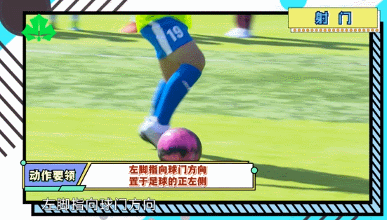 左脚指向球门方向,置于足球的正左侧,左脚脚弓内侧正对足球,左腿弯曲,摆右腿,大腿带动小腿,右脚脚弓内侧正对足球,用合适力度将球射出。