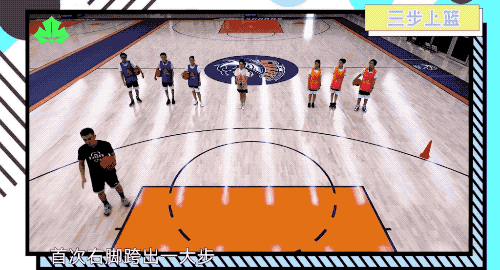 右脚跨出一大步,左脚跨出一小步并用力蹬地起跳,然后右腿屈膝上抬,同时举球至头右侧上方,右臂向前上方伸出,食、中指用力拨球,通过指端将球投出。投球时可以通过打板提高命中率哦!