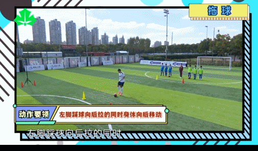 左脚踩球向后拉的同时,身体向后移动,并用右脚踩住足球,两脚依次交替拖球后退,注意双脚的协调性及拖球的力度。