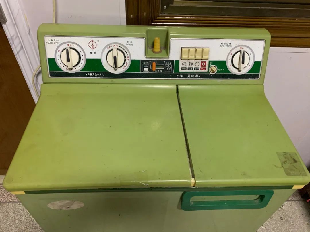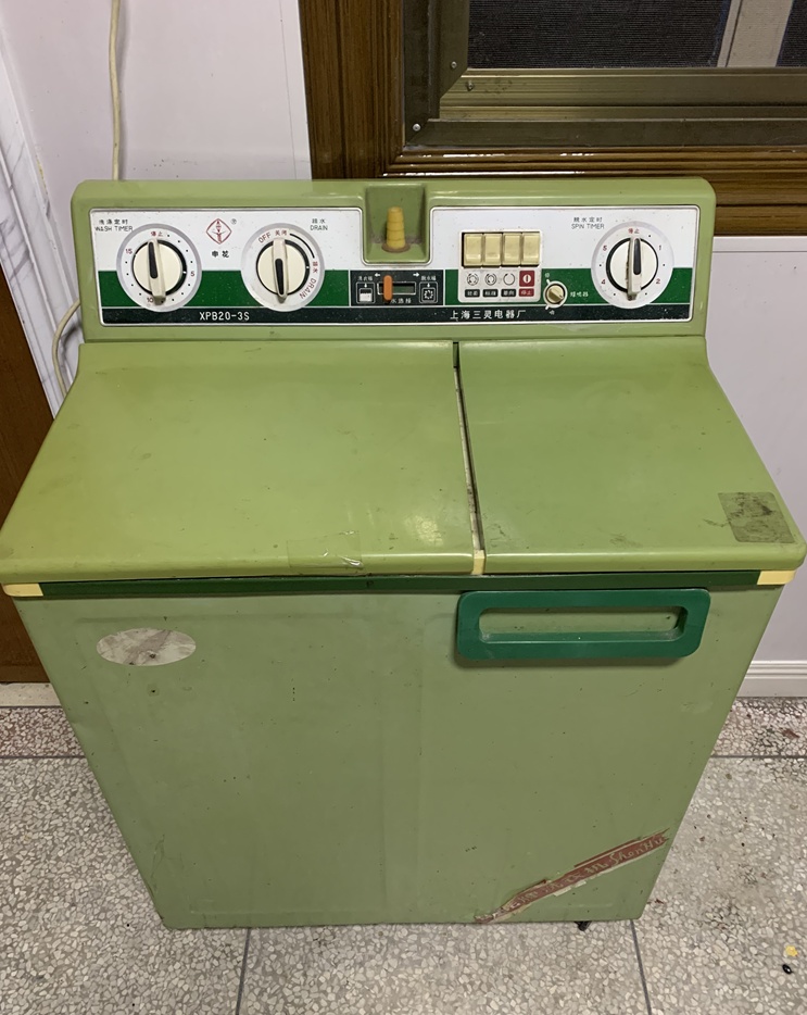 这台申花牌双筒洗衣机购置于1988年,是母亲的嫁妆,年纪比我大2两岁。具体的购买价格没人能回忆得起来了,只隐约记得应该相当于当时在崇明乡镇企业上班的父母亲几个月的工资。洗衣机一个桶是洗衣桶,洗完之后再将衣服放进另一个脱水桶里,放进脱水桶时,必须要将衣服放平压实,否则洗衣机工作起来就会如拖拉机启动一般,机身抖动个不停。