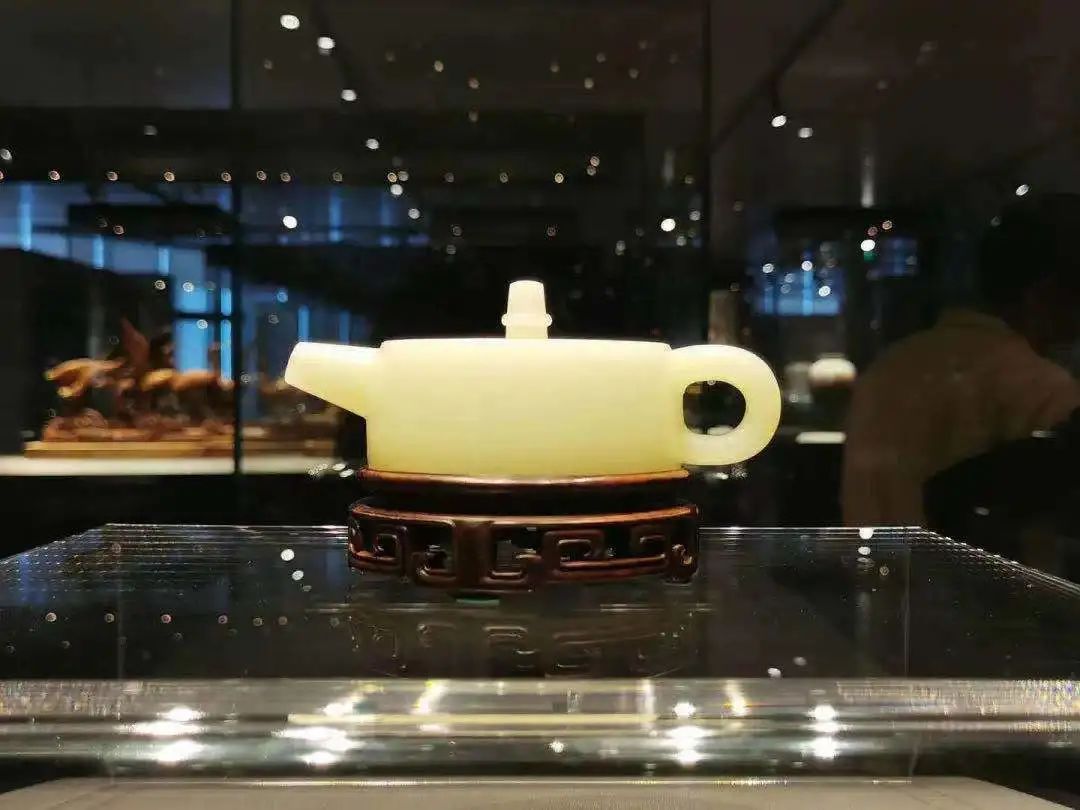 馆内藏着不同风格的众多玉雕作品。记者在此温馨提示大家,看起来最简单的,往往就是最复杂的,比如下面这件外表平平无奇的玉雕井栏壶。