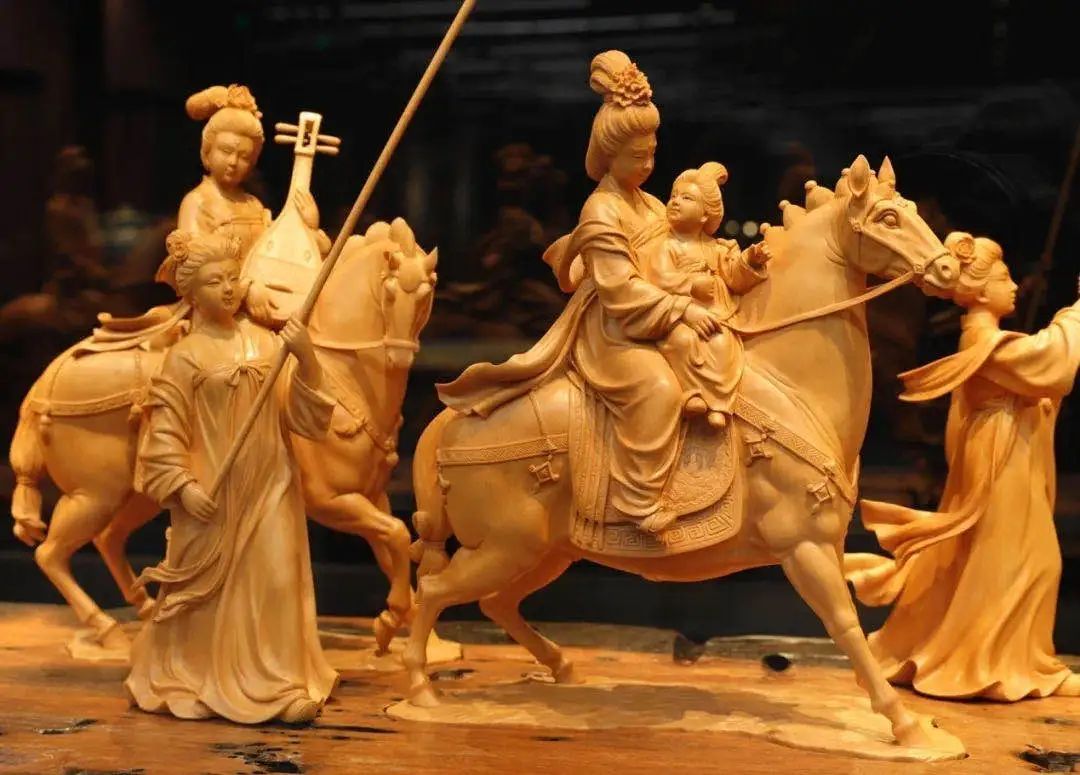 宝库匠心馆汇集了中国四大木雕中的黄杨木雕和东阳木雕。其中,小布要特别说明的是一组黄杨木雕作品《踏春》,黄杨木雕生长速度极其缓慢,很难有大体积的作品,而《踏春》极有创意地用群像的方式,组合出一幅气势宏大的画面,作品取材于唐代名画《虢国夫人游春图》。虽做了一定程度的演绎和艺术加工,但用极度写实的雕工还原出了原作那种盛唐的雍容气象。