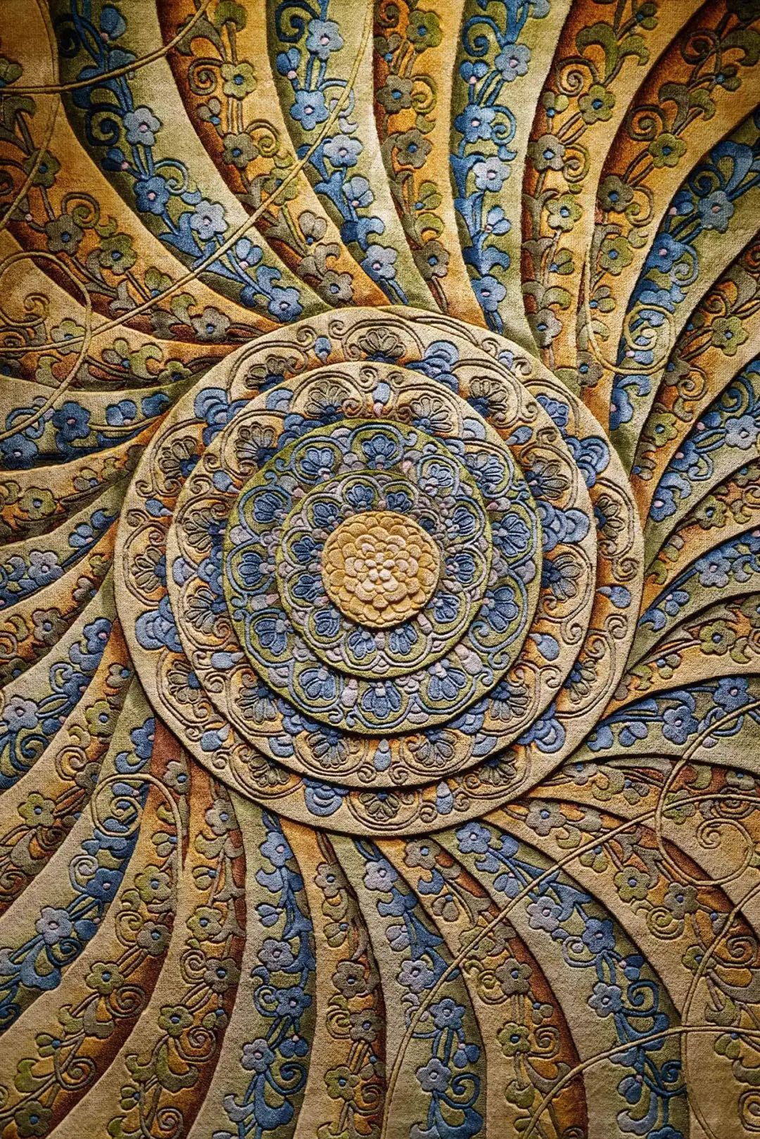 新疆地区是地毯的发源地之一。当这种工艺形式从新疆传入江南,用来编织的材料就从羊毛变成了蚕丝,丝毯由蚕丝纯手工编织而成。所谓“一丈毯,千两丝”,每一平方英尺丝毯通常要手工打出14400个“8”字结。一条优质的、长宽均约两米的手工丝毯制作过程至少需要一年。