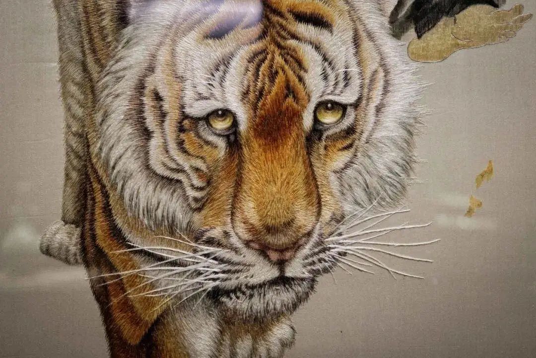 相对于苏绣的精细,湘绣的画风就比较粗犷厚实。靠放射性线条的叠加来表现质感和体积感,非常适合用来表现猛虎皮毛的厚实刚劲。