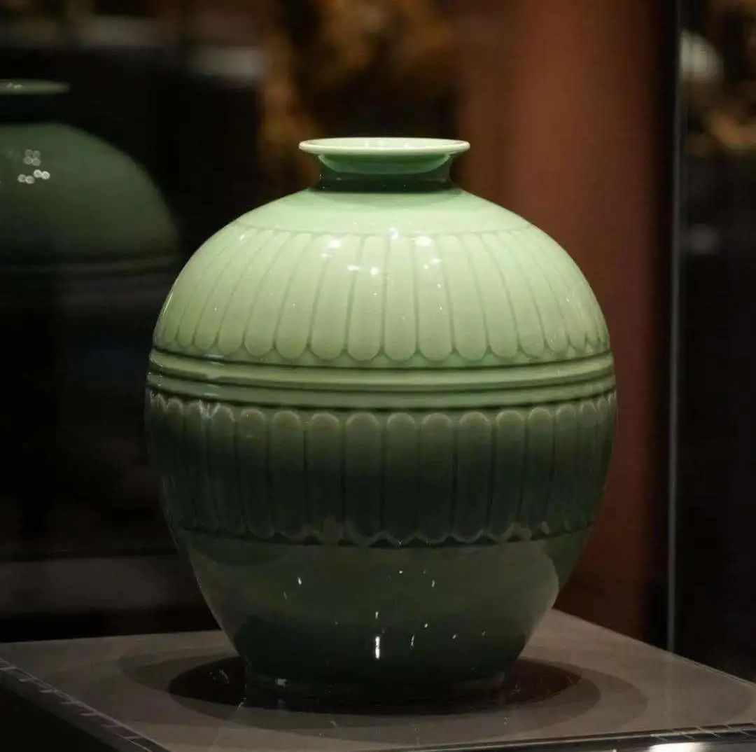 龙泉以烧制青瓷而闻名世界。2009年,龙泉青瓷传统烧制技艺入选世界非物质文化遗产保护名录,是全球第一也是唯一入选的陶瓷类项目。馆内展出的龙泉青瓷青釉菊瓣瓶来自龙泉青瓷界“祖师爷”级别的人物徐朝兴。造型饱满、规整端庄、釉色青翠,代表了现代龙泉青瓷的最高水平。