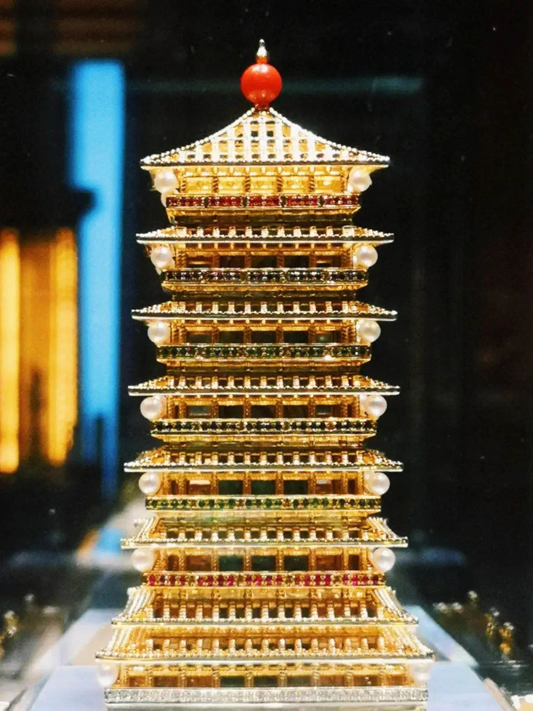 当金属被制作成装饰品时,它遇到了一个形影不离的伙伴,这就是珠宝。以金银为骨架,以珠宝做点缀,宝库匠心馆内就有这么一件珠宝镶嵌作品——七宝长安美人塔。塔身为银胎,表面鎏金,宝塔共7层,每层镶嵌钻石、红宝石、蓝宝石、祖母绿、珍珠等不同颜色的宝石。塔顶镶嵌牛血红珊瑚,内部配有用黑色鲍鱼贝制作出的塔心,整体色彩富丽,散发出独有的光芒。