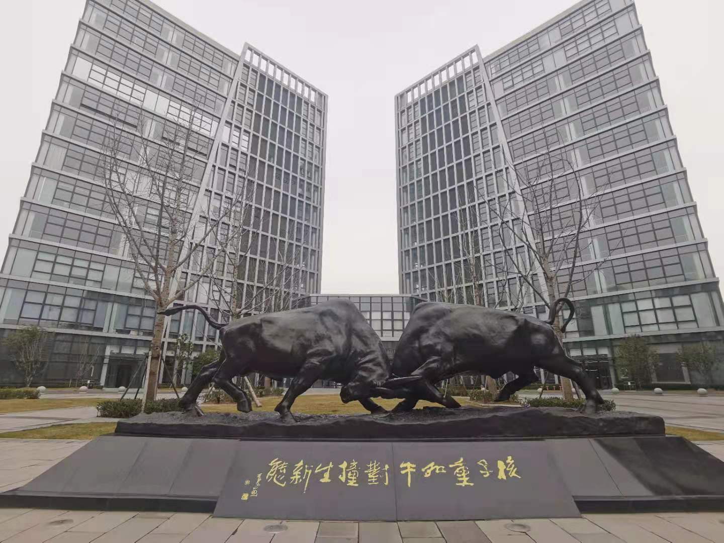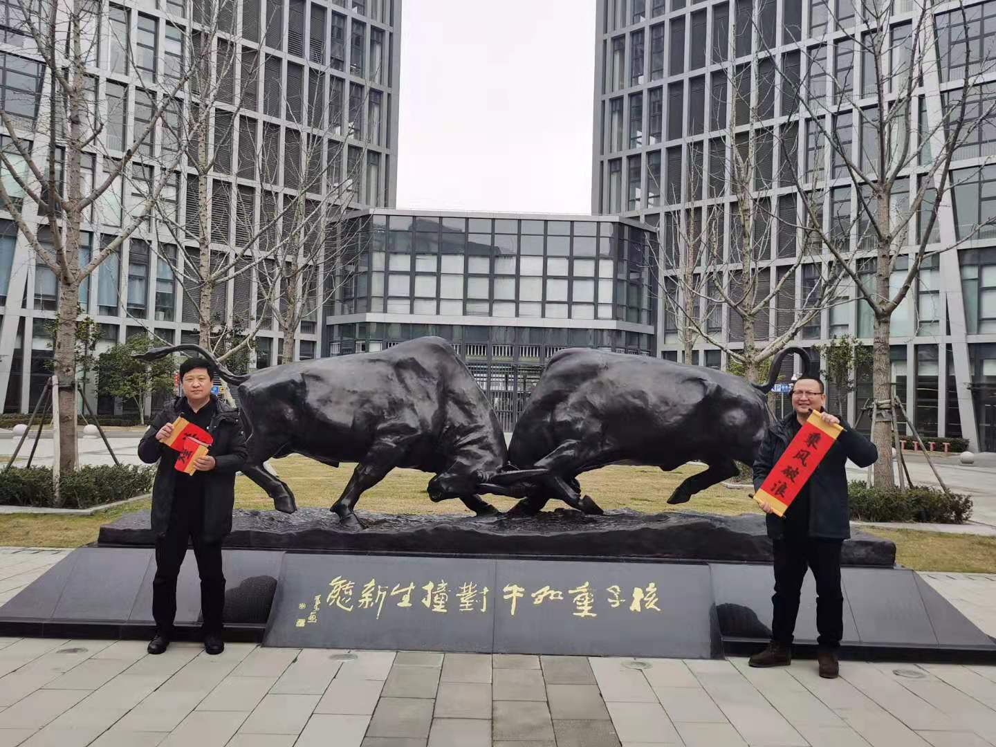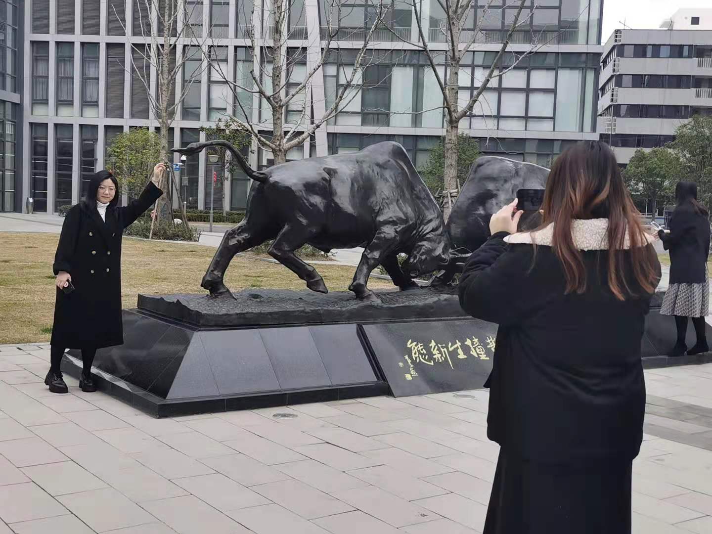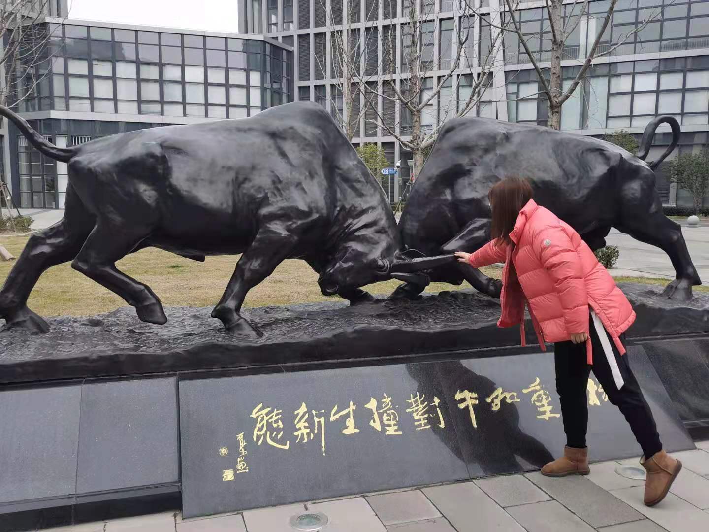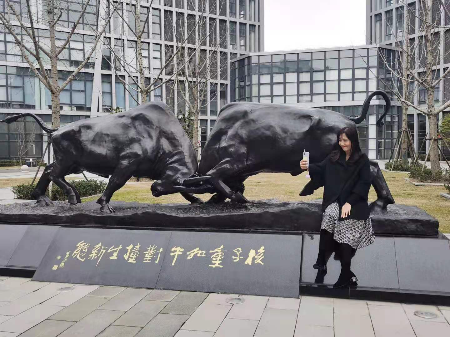 摸一摸牛腿、拍几张照片、录一段视频……牛年到,位于启迪漕河泾(中山)科技园·紫荆园广场的两只通体黑得发亮的铜牛雕塑迎来不少人打卡拍照。