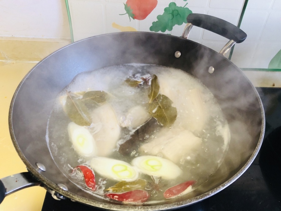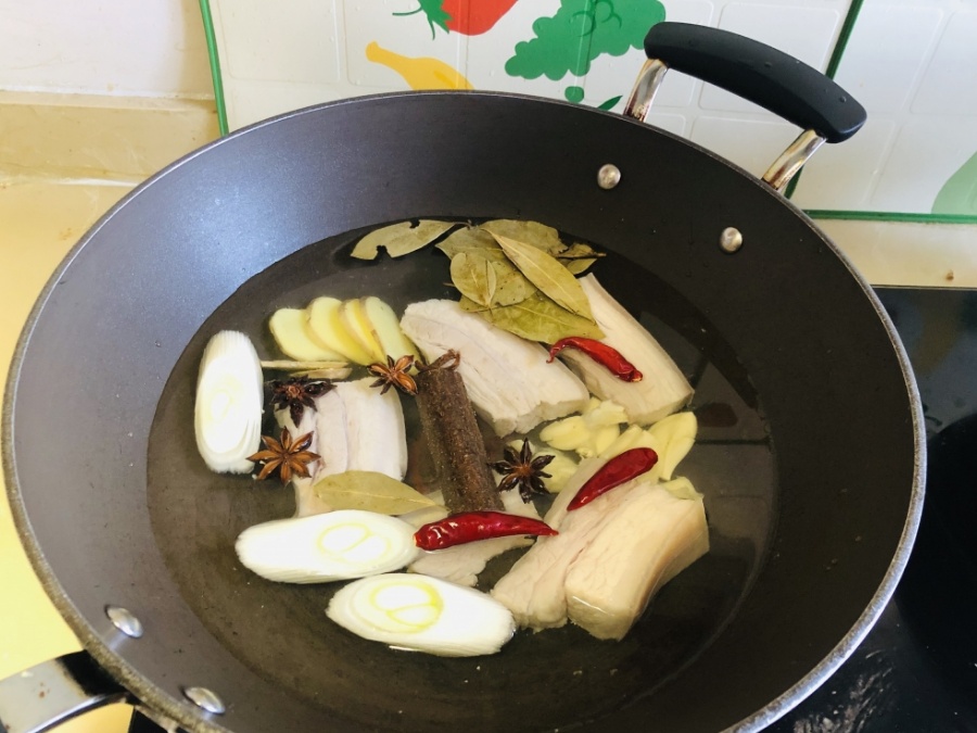 3.锅中加冷水没过五花肉,放入八角,桂皮,香叶,干辣椒,大葱,蒜头,姜片