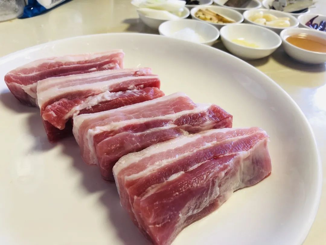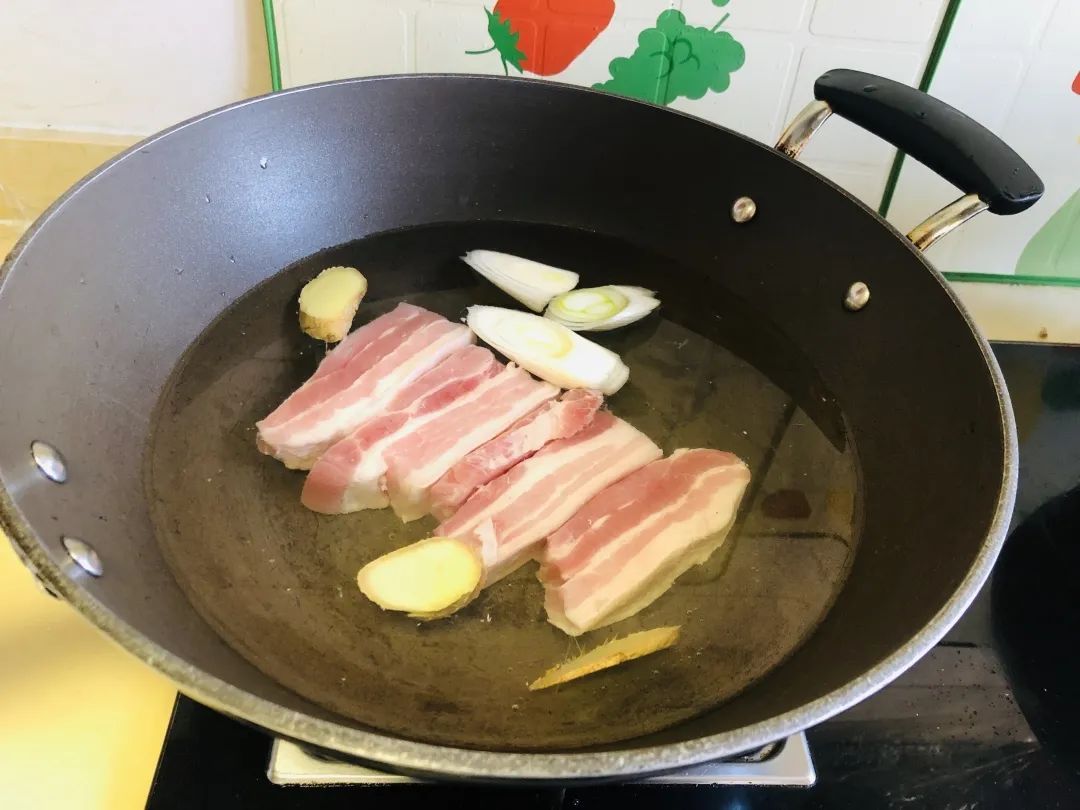 2.五花肉冷水下锅,加大葱、姜片、料酒,焯水去腥后洗净