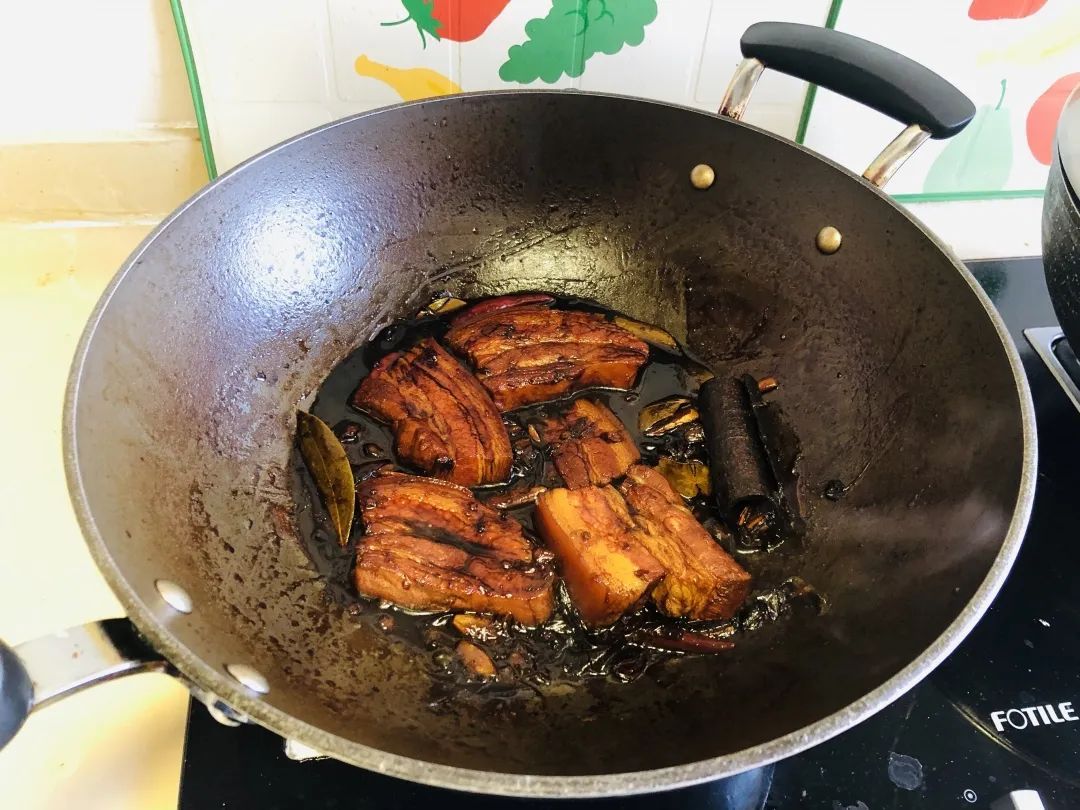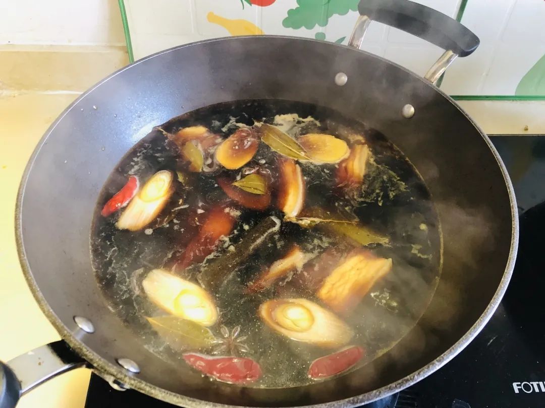 5.加入料酒,生抽,老抽,白糖,鸡精,大火煮沸