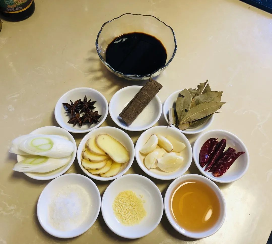 五花肉、八角、桂皮、香叶、干辣椒、大葱、蒜头、姜片、白糖、鸡精、料酒、生抽、老抽